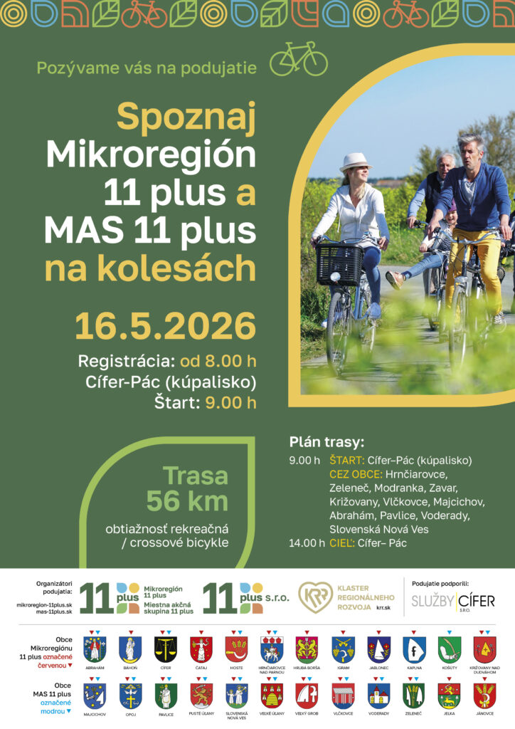 Milí priaznivci tradičného cyklo podujatia Spoznaj Mikroregión 11 PLUS a MAS 11 PLUS na kolesách. Je tu termín pre jar 2026.  Registrácia od 8:00 v Cífer – Páci pri archeo skanzene 16.05.2026, štart 9:00 hod. Predpokladané ukončenie okolo 14:00 hod.